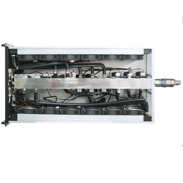 ZC-CDU-36 尺寸为L850*W436*H380MM,内部由2组超大冷排、分水器、多泵组成,它作为液体冷却系统的核心部件,负责冷却液的精准分配,温度调控,兼容安装标准机柜。广泛应用于数据中心,工业制造,医疗设备等领域的散热场景。